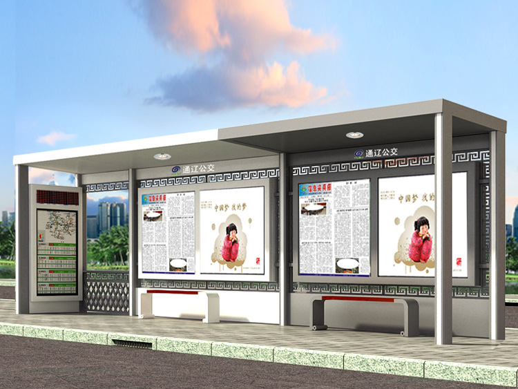 公交車候車亭一般是與公交站牌相配套的,為方便公交乘客候車時遮陽、防雨等,在車站、道路兩旁或綠化帶的港灣式公交停靠站上建設的交通設施。由于城市公交的日益發達,候車亭已發展成為城市一個不可或缺的重要組成部分,設計精美的候車亭也成為了城市一道美麗的風景。 一般候車亭棚體主要頂棚、立柱、頂弓、廣告燈箱和坐凳組成,也有用隔板來代替廣告燈箱的。